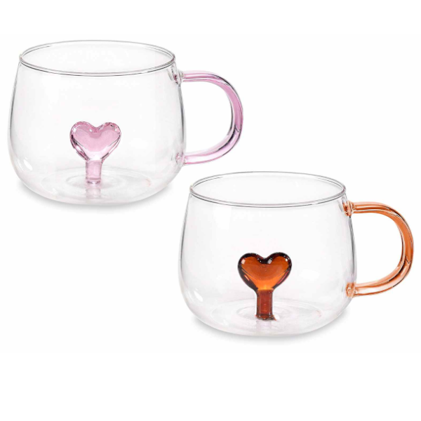 Tazze in vetro trasparente con cuoricino interno 3D e manico colorato 300 ML Misure: Ø 9 cm x 7,5 H