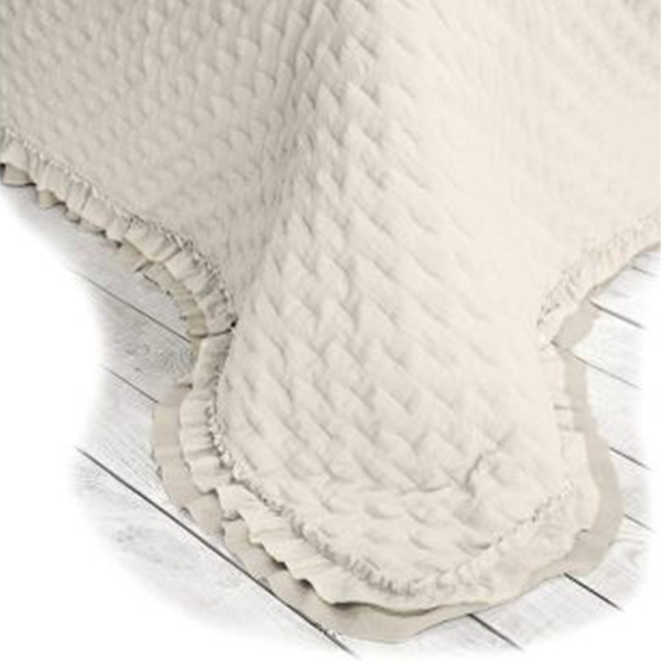 Trapuntino ideale per le mezze stagioni ed i periodi estivi realizzato in stile Shabby Chic con doppio volantino a contrasto sui bordi e trapuntatura a termosaldatura. Prodotto dall’ottimo rapporto qualità/prezzo è un elegante e classico componente d’arredo che si accosta alla maggior parte degli stili delle camere da letto.