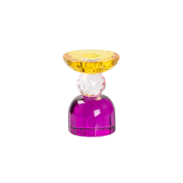 Il Porta Candela Harmony nella versione Ambra e Fucsia è un oggetto studiato per chi ricerca un'eleganza solare e sofisticata. Questo modello gioca con la stratificazione di tre elementi in cristallo colorato in massa: una base cilindrica in un vibrante fucsia, un corpo centrale sferico in cristallo trasparente e un piattino superiore color ambra. La combinazione cromatica richiama i colori del tramonto, diffondendo una luce calda e accogliente in ogni ambiente.